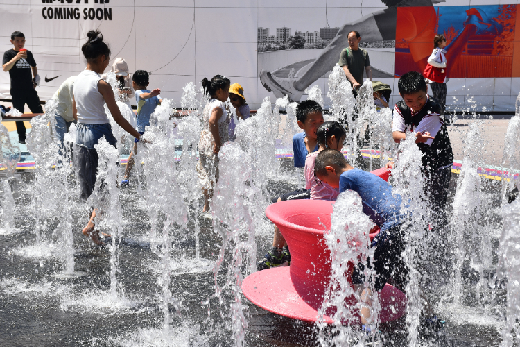 7月6日,北京,高温天气持续,不少家长带着孩子在一处喷泉戏水纳凉。视觉中国