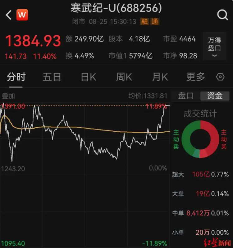 据多家媒体报道,“国产AI芯片第一股”寒武纪(688256.SH)股价连日上涨,过去5个交易日涨超45%。截至8月25日收盘,寒武纪股价报1384.93元/股,当日涨幅11.40%,市值达5794亿元。此前的8月19日,寒武纪股价盘中突破千元大关,高点飙升至1001.1元/股,创出历史新高。