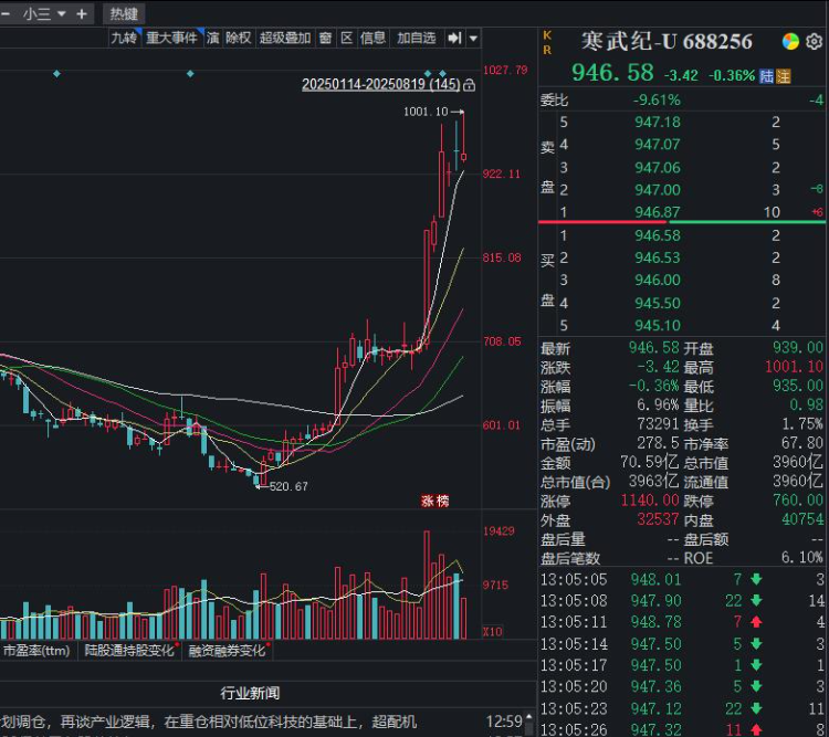 8月19日,寒武纪股价盘中突破千元大关,高点飙升至1001.1元/股,创出历史新高,正式叩开了A股千元俱乐部的大门,成为仅次于贵州茅台的第二高价股。