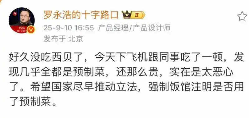 罗永浩在微博中吐槽西贝的预制菜。 微博截图