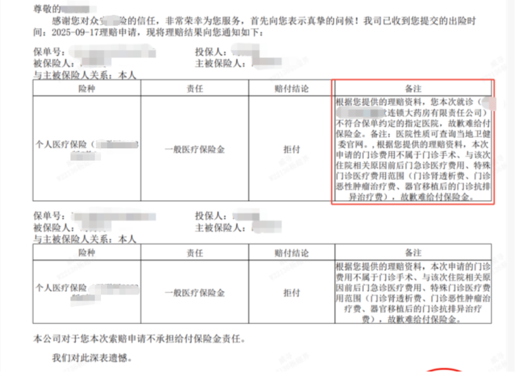 如果说保费上涨还能接受,但理赔时审核员敷衍了事的态度更让张女士感到气愤。张女士介绍,今年7月份她在医院进行了门诊手术,但在申请理赔时却出现了问题,“我是2月份时出现了身体不适,就医后被告知可以先进行治疗,但因后期治疗效果不佳,又在门诊进行了手术。手术后开了一些治疗的药,有可以医保报销的,也有自费药。因为当时(保单)承诺门诊手术可以报销,医保外用药也可以报销,所以我就线上申请了理赔。”张女士说,在申请理赔时她发现虽然保险显示是1年期按月缴费,但诊疗时间却无法选择2月份,只能选择最近的一次就诊时间,即今年7月。在根据要求上传了身份证、就诊发票等相关材料后,2天后张女士被拒赔。