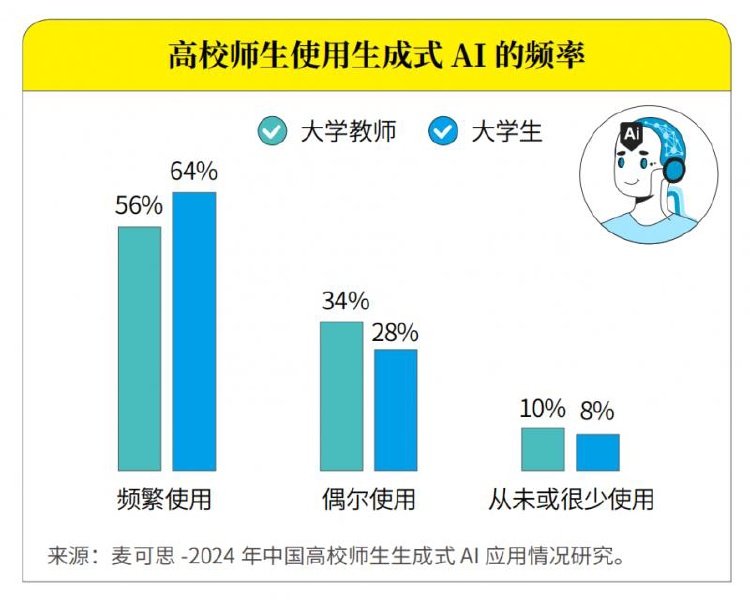 与小程有着同样想法的人不在少数。据第三方机构“麦可思”对超3000名高校师生的问卷结果显示,近六成高校师生每天或者每周多次使用生成式AI。而大学生在使用生成式AI时,有近三成主要用于写论文或作业。