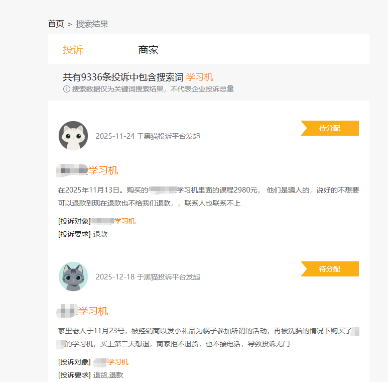 在知名消费投诉平台“黑猫投诉”上,搜索关键词“学习机”就能显示多达9336条投诉,记者查看了这些消费者投诉帖,发现大多都是有关AI学习机,投诉的内容主要为三类:虚假宣传和诱导消费;质量问题和售后推诿;消费者质疑AI学习机是“伪智能”。