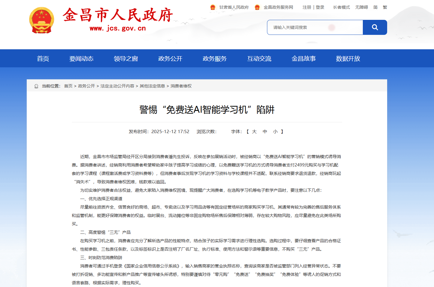 针对AI学习机存在的乱象,相关部门也在行动。目前甘肃金昌市、宁夏银川市等地的市场监管部门,都通过政府官网和媒体,发出了有关AI学习机的风险提示信息。记者查看了金昌市政府官网,该市市场监管局在今年12月1日发布了题为《警惕“免费送AI智能学习机”陷阱》的风险提示,提醒消费者要优先选择资质齐全、信誉良好的商场、超市、专卖店以及学习用品店等有固定经营场所的商家购买学习机,避免在临时展台、流动摊位等非固定购物场所购买;同时高度警惕“三无”产品,时刻防范消费陷阱,注意索要购物凭证。