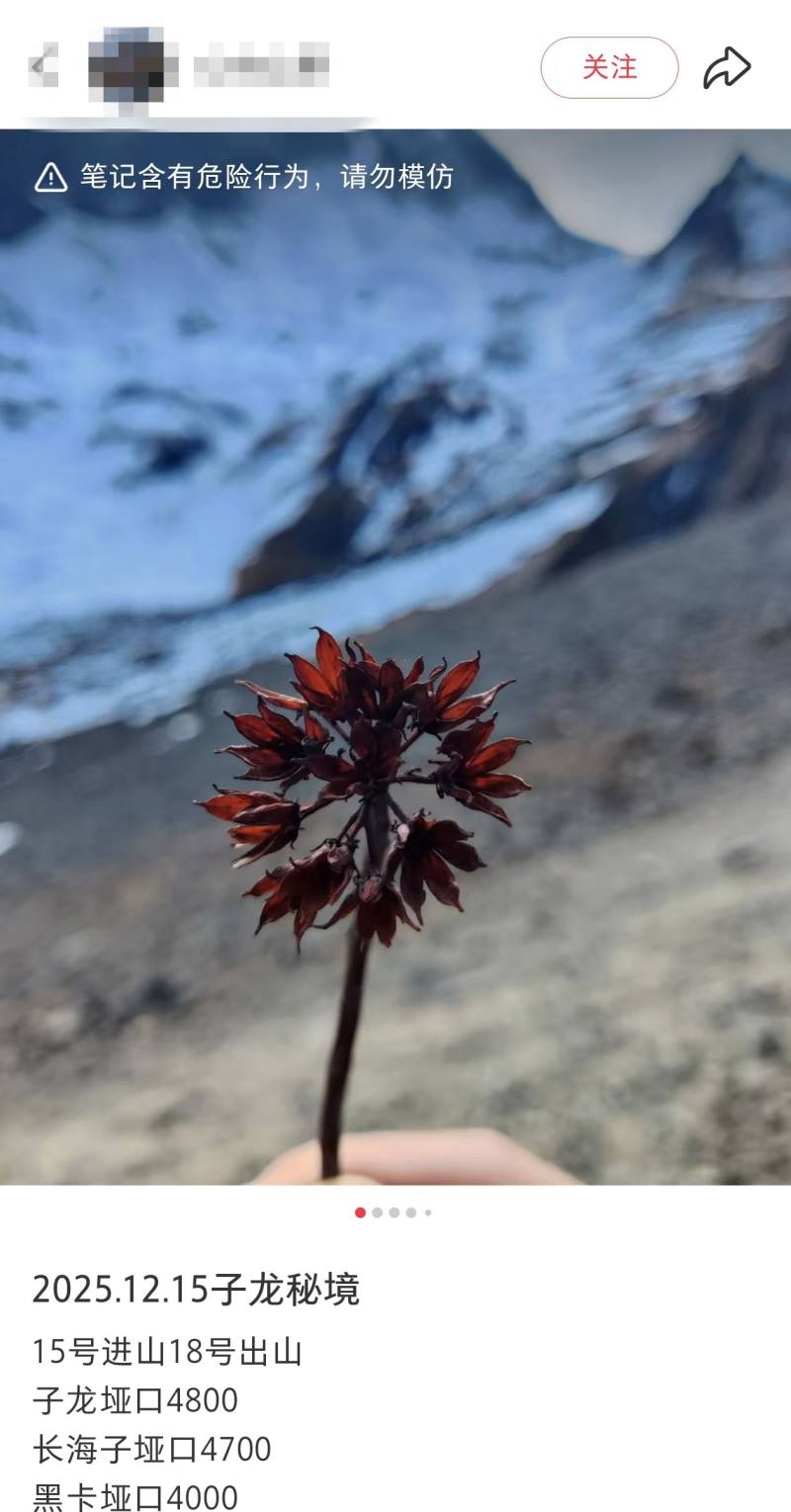12月23日,上游新闻登录某主流社交平台搜索发现,即使今年10月刚发生徒步者遇难,仍有不少博主仍在发布深入“子龙秘境”的经验帖,其中不少还是近期的。其中一篇帖子是标题是“2025.12.15子龙秘境”,写着“15号进山18号出山,子龙垭口4800(海拔)、长海子垭口4700、黑卡垭口4000”。组队组团帖也不少,比如“11.2子龙秘境组队,四天三晚包车走”“子龙秘境二路线穿越到小金,有想的搭子请进”,这些帖子多多少少都有人回复,还有人在询问路线和收费情况,但部分帖子被平台标注了“含有危险行为,请勿模仿”等提示语。