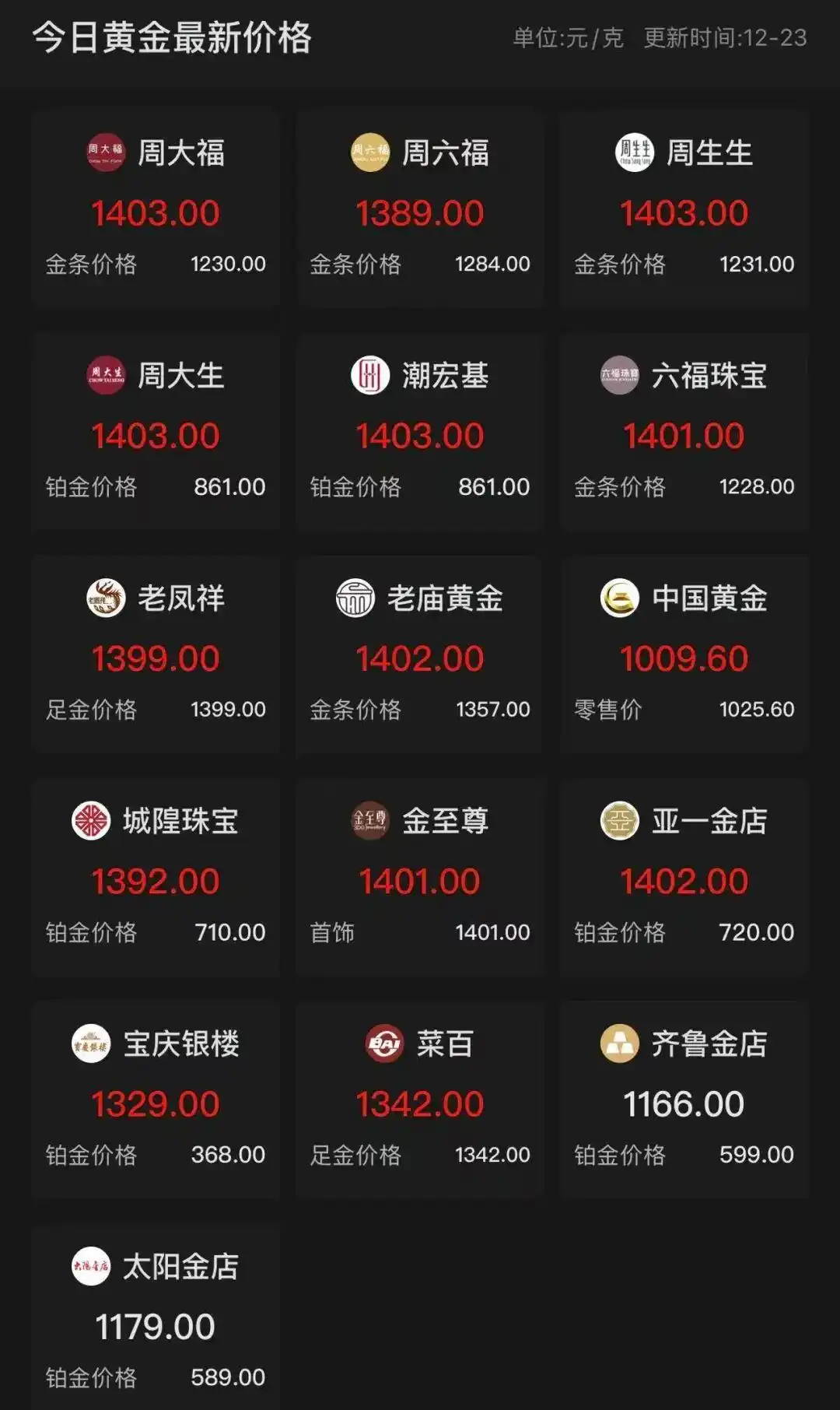 12月23日,多个品牌足金饰品报价首次冲上每克1400元。每日经济新闻