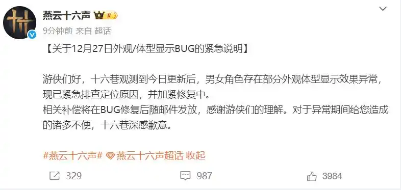 12月27日,官微@燕云十六声 发文道歉 :