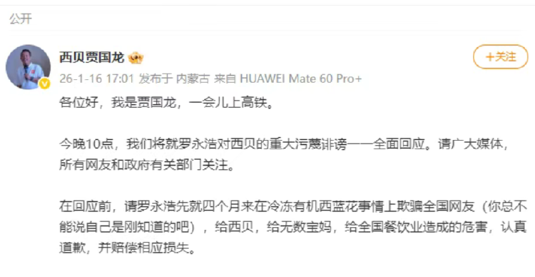 两小时后,贾国龙在微博发布“预告”,称将于晚上10点“就罗永浩对西贝的重大污蔑诽谤一一全面回应”,并要求罗永浩认真道歉、赔偿损失。
