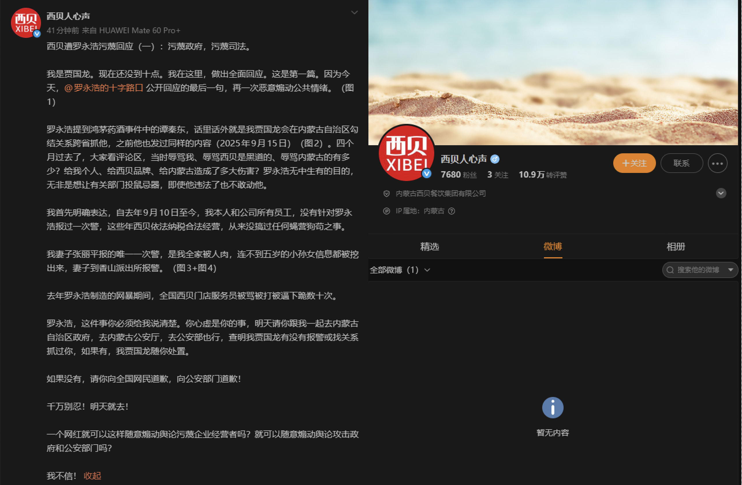 贾国龙通过@西贝人心声发博文,目前内容已被清空。网页截图