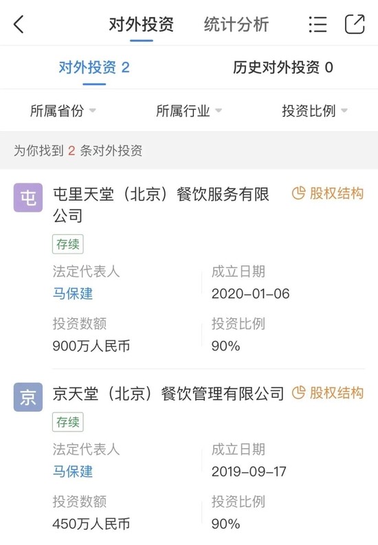 此外,北京天堂超市管理有限公司名下还有两家子公司,分别为屯里天堂(北京)餐饮服务有限公司和京天堂(北京)餐饮管理有限公司,注册资本分别为1000万元、500万元。北京天堂超市管理有限公司对这两家公司的投资数额分别为900万元、450万元,持股比例均为90%,另外10%股份则为詹小虎持有。