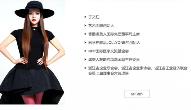 在虞美人国际集团网站上,于文红被称为“会长”,其身上还被贴上了“艺术面雕创始人”“香港虞美人国际集团董事局主席”“虞美人救助专项基金副主任委员”“浙江省企业联合会、浙江省企业家协会、浙江省工业经济联合会第七届理事会常务理事”等标签。