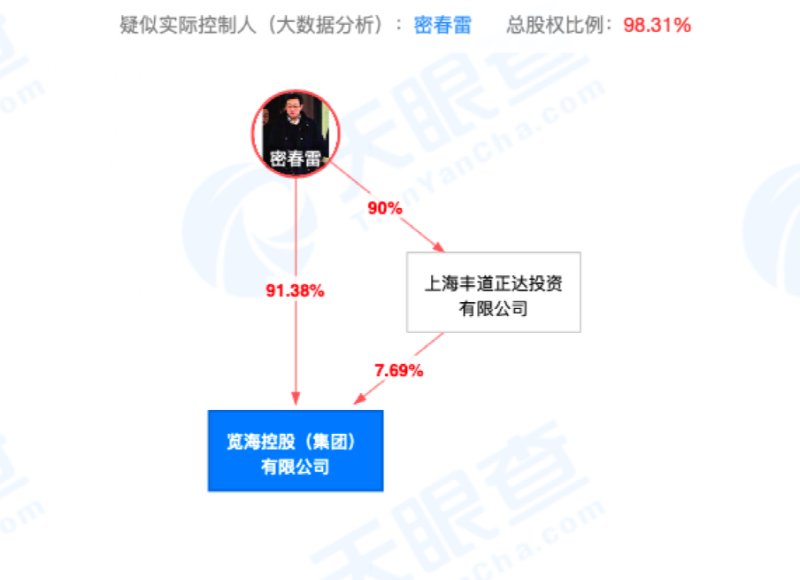 上海览海投资有限公司由览海控股(集团)有限公司100%持股,最终实控人为密春雷。览海控股(集团)有限公司成立于2003年,注册资本达65亿元,密春雷为公司法定代表人、执行董事,持股占比为91.38%。