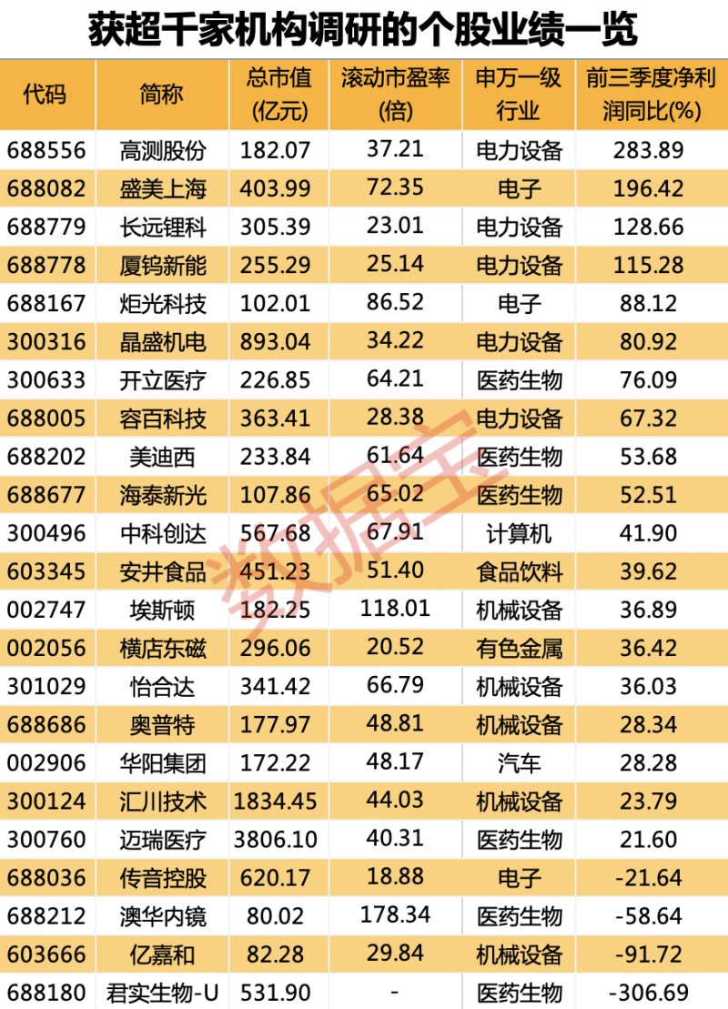 数据宝统计,调研机构数量超千家的23家公司中,高测股份、盛美上海、长远锂科、厦钨新能前三季度净利润同比翻倍,炬光科技、晶盛机电、开立医疗等增幅逾50%。