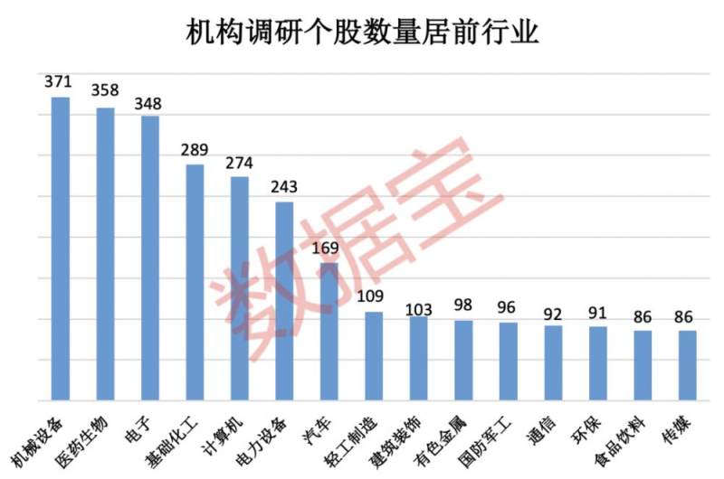 数据宝统计,今年以来,机构调研的公司主要集中在8个行业,每个行业被调研公司数量均超100家。机械设备、医药生物、电子行业被调研公司数量位居前三,均达到300家以上,数量远超其它行业。