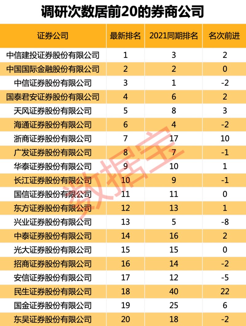 与2021年对比来看,今年调研次数前20名的券商中,民生证券成为最大“黑马”,今年以来累计调研1274次,相比去年同期增长230%,调研次数排名从去年第40名提升至第18名。