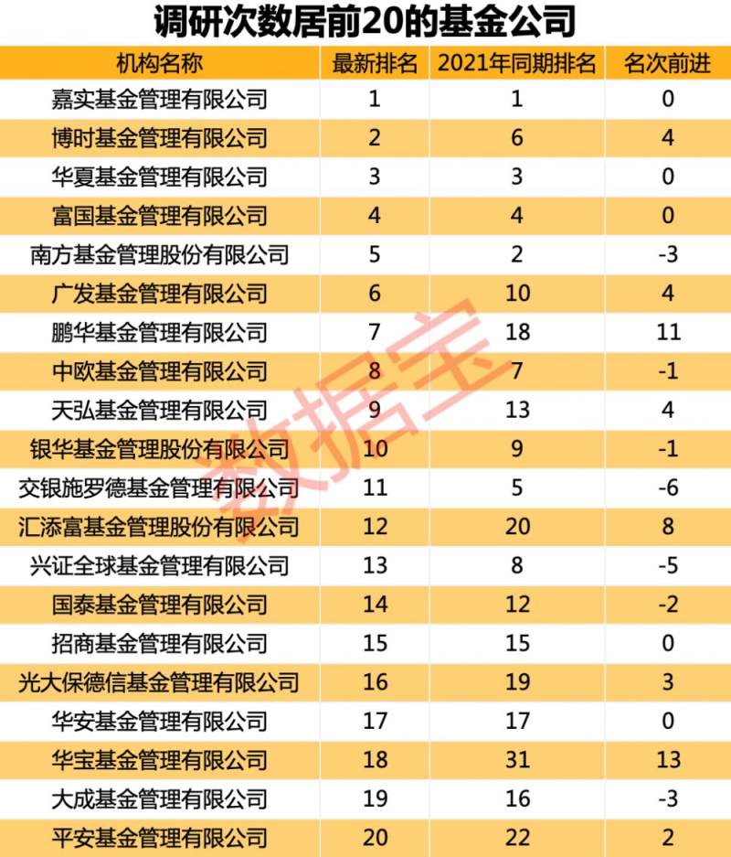 数据宝统计,45家基金公司累计调研超千次,其中嘉实基金、博时基金调研次数超过2000次。从基金公司调研次数排名变动来看,8家基金公司排位有所上升,华宝基金调研达1390次,排名从2021年同期的第31名上升至第18名。钧达股份、科华数据、君亭酒店等8家公司获得华宝基金调研后的平均上涨幅度超100%。