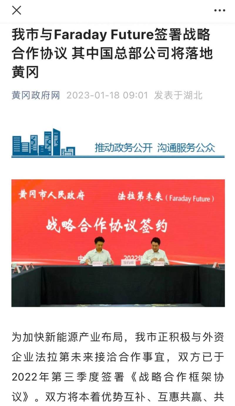 FaradayFuture官微宣布与湖北黄冈市签订战略协议,并与FF Global签署新股东协议。根据双方签订的框架协议,为进一步实现优势互补、互惠互利、共同发展,双方应在投资、科技创新、产业转型、区位、政策等方面贡献各自的优势。预计黄冈市政府将积极协助FF在黄冈市进行产业布局,调配相关资源,同时为FF在黄冈市的创业项目提供包括但不限于资金和政策方面的支持。Faraday Future拟将其FF中国总部迁至黄冈市,同时保留其位于加州洛杉矶的全球总部。FF中国总部预计将由黄冈市政府引导基金、相关产业基金和FF共同出资建设。该框架协议已于2022年第三季度签署。