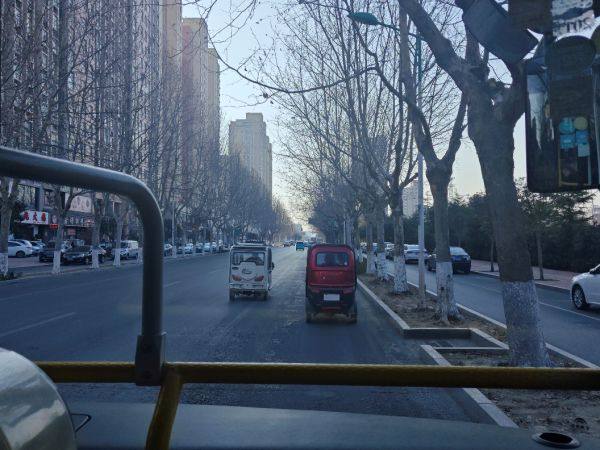 图:空载的商丘公交车与同路行驶的电动三轮(张英/摄)