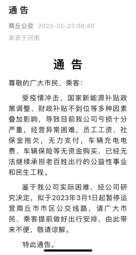 乘客稀少带来的运营收入少,是2月23日商丘公交公司发布“停运通告”的背景之一。根据该公告,商丘公交公司受疫情冲击、国家新能源补贴政策调整、财政补贴不到位等多种因素叠加影响,导致公司亏损严重,经营异常困难,已经无法继续承担老百姓出行的公益性事业和民生工程,拟于2023年3月1日起暂停运营商丘市区公交线路。