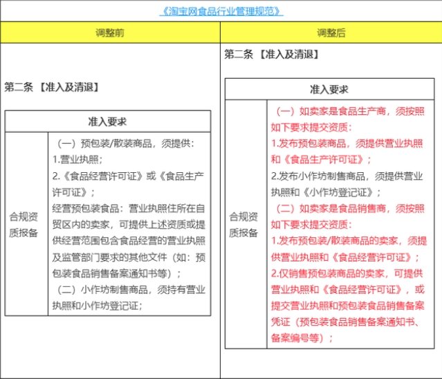 根据在2022年4月20日生效的《淘宝食品行业管理规则》,对销售食品的卖家准入规则为:(一)预包装/散装商品应当提供:1.营业执照;2.食品经营许可证或者食品生产许可证;经营预包装食品:营业执照在自贸区内的销售者,可提供上述资质或提供涵盖食品经营的营业执照及监管部门要求的其他文件(如预包装食品销售备案通知书等);(二)小作坊销售商品,必须持有营业执照和小作坊登记证。