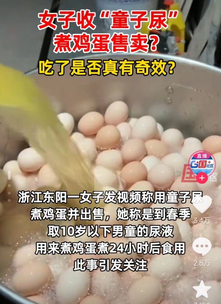 据河北广电报业融媒体“国+社区”报道,一名浙江东阳女子卢女士介绍说,童子蛋是浙江东阳的非物质文化遗产,会在春季取10岁以下男童的尿来煮鸡蛋,“将鸡蛋煮24小时后食用”。卢女士称,男童的尿液中含有一种名为“人中白”的成分,“据说吃了以后夏天不会中暑”。她表示,这些尿液都是自己亲自去幼儿园里接的:“煮出来的鸡蛋就跟臭豆腐一样,闻起来是臭的,但是吃起来很香,是咸咸的味道。”