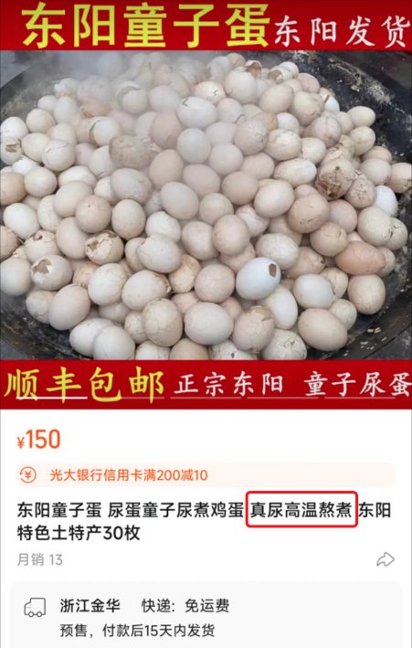 记者注意到,童尿蛋在当地的价格从2元一个到4元一个不等,每年二三月份也有一些当地网店会售卖童子蛋。记者在淘宝上看到,一家售卖金华东阳土特产的店铺就挂出了150元30个的“东阳童子蛋”,商家坦言,“如果你从来没吃过,可能会接受不了,就算是本地人,如果不是从小吃到大,也不敢吃的。”
