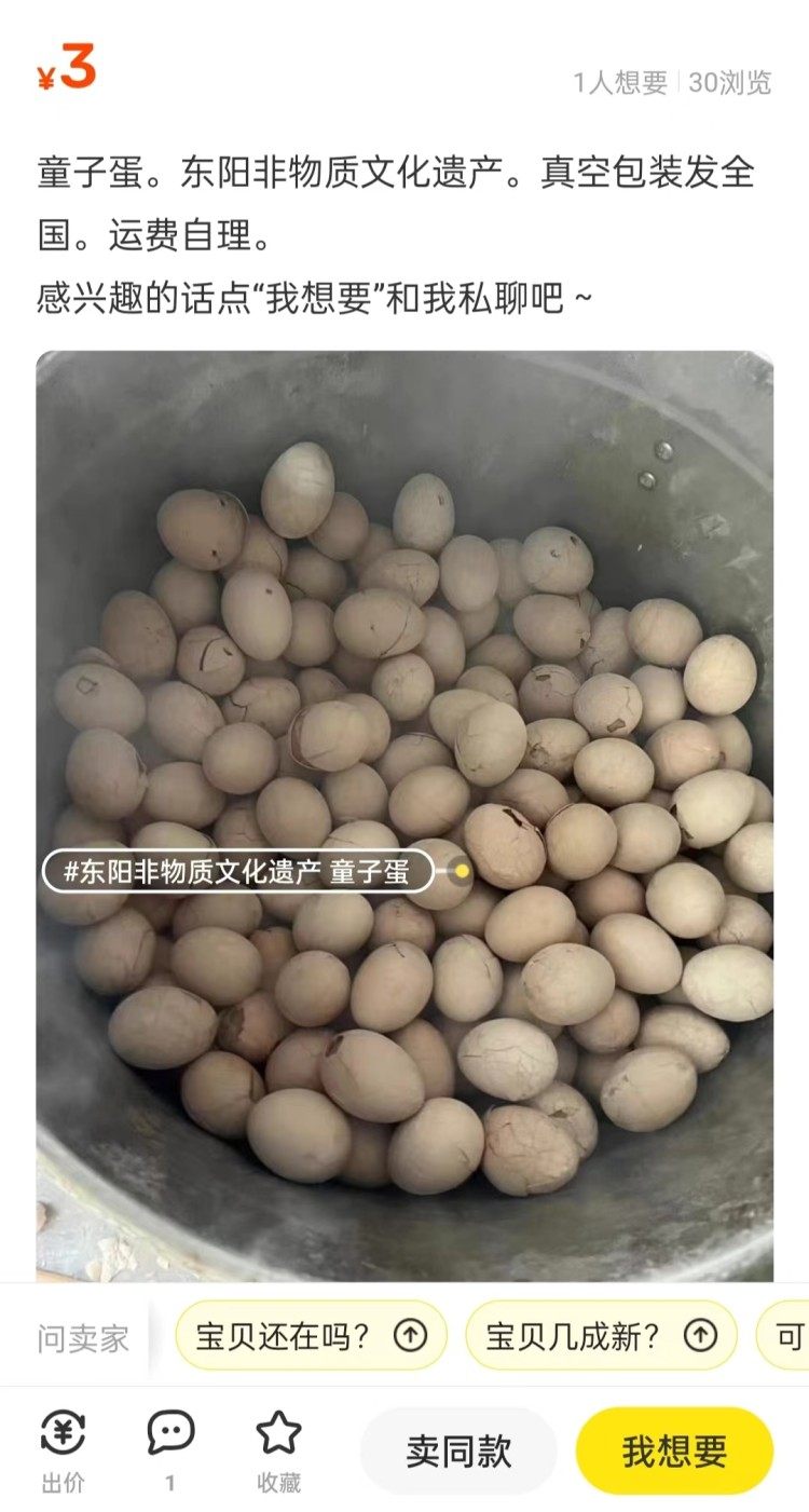 截至发稿,上游新闻记者注意到淘宝上的“东阳童尿蛋”“童子蛋”等商品已下架。但在闲鱼APP上,记者发现仍然有不少商家在售卖“童尿蛋”,标价2.5-3元一个。有卖家称“春季必送佳品”,并表示可快递至江浙沪和北上广。