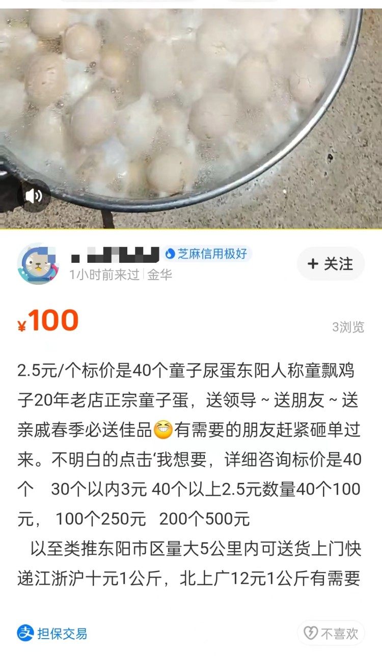 近日,有网友在抖音上发视频展示用童子尿煮鸡蛋,引发热议。上游新闻记者发现在淘宝及闲鱼APP上,均有卖家出售“童尿蛋”,并保证“真尿熬煮”。不过,此类卖家大多无食品经营许可证、营业执照和小作坊登记证等准入要求的资质。