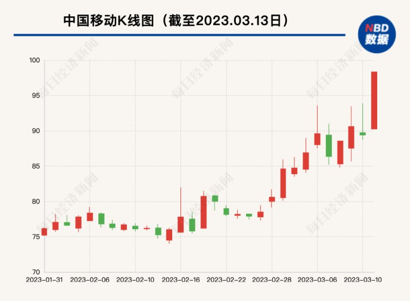 中国移动(600941)作为三大通信运营商龙头,3月13日开盘即引领通信板块上涨,下午盘中成功封涨停,A股创98.34元/股的历史新高,若A+H股都以A股股价计算,则中国移动总市值超过2.1万亿。