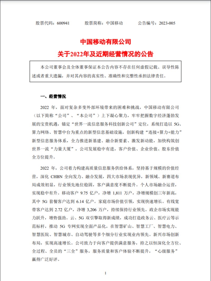 据中国移动公告,2022年,移动客户达到9.75亿户,净增1811万户,净增规模创三年新高,其中5G套餐客户达到6.14亿户。2023年1月,公司移动客户数达到9.76亿户,其中5G套餐客户数6.22亿户,有线宽带客户数达到2.75亿户。