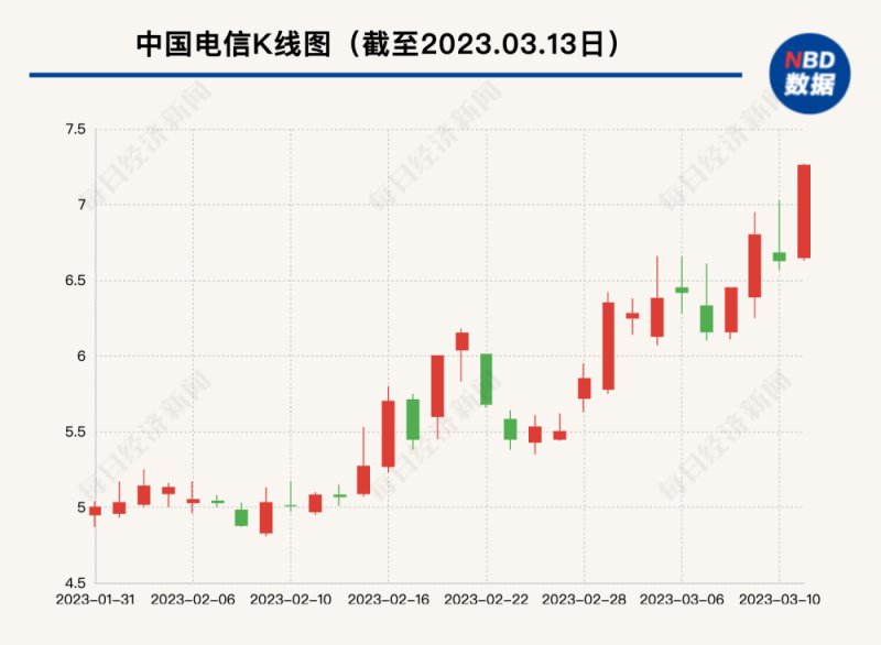 值得一提的是,3月13日,中国电信(601738)、中国联通(600050)股价同样大涨,中国电信收涨9.5%,总市值6643.4亿,中国联通收涨5.4%,总市值1924.2亿。