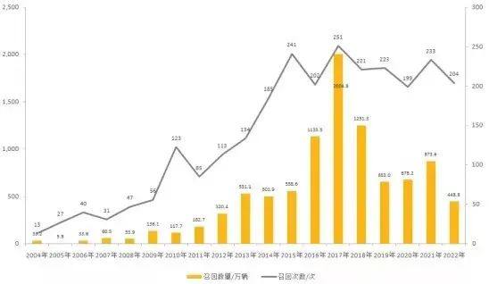 据统计,2022年无论是召回批次还是召回总量,均出现了明显下滑,其中召回总量达到了近十年来的最低点。