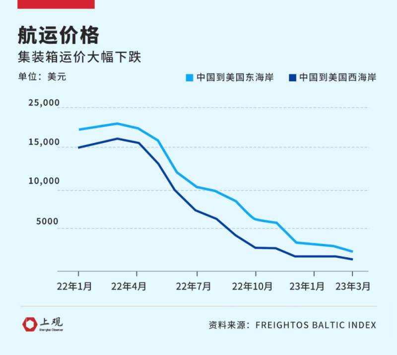 价格变化背后是供需关系的此消彼长——疫情三年航运公司不断增加运力、订购集装箱,如今航运业周转效率恢复正常,船和箱子不再堵在路上,运力过剩和空箱堆积的问题一下子变得突出;另一方面,疫情期间商家“囤货”过多,导致去年下半年以来外贸需求下降。