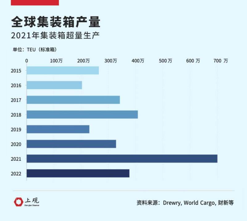 张毅指出,全球主要港口空箱堆积的另一个重要原因是疫情期间集装箱产量过大。航运咨询公司德鲁里(Drewry)数据显示,2021年,全球生产了700多万个集装箱,是常规年份的3倍。2021年,造箱龙头企业中集集团集装箱销量是上一年的2.5倍。中集集团在2021年财报中写道:“本集团集装箱产销量创历史新高,营业收入和净利润同比均有大幅增长。”