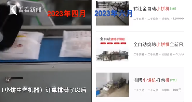 有小饼生产设备制造商透露,不少客户刚投入生产半个月,甚至一周,就主动降价一半转卖机器。这位制造商直言,由于淄博小饼加工厂已经饱和,这些机器如今即使打对折也很难出手,他们只能去外省市找人“接盘”。