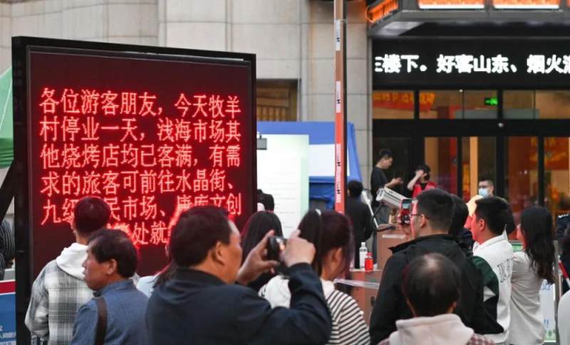 4月29日,在淄博一家烧烤店前,店主通过电子屏公示停业休息信息,提醒游客合理安排行程。图片来源:新华社 董乃德 摄