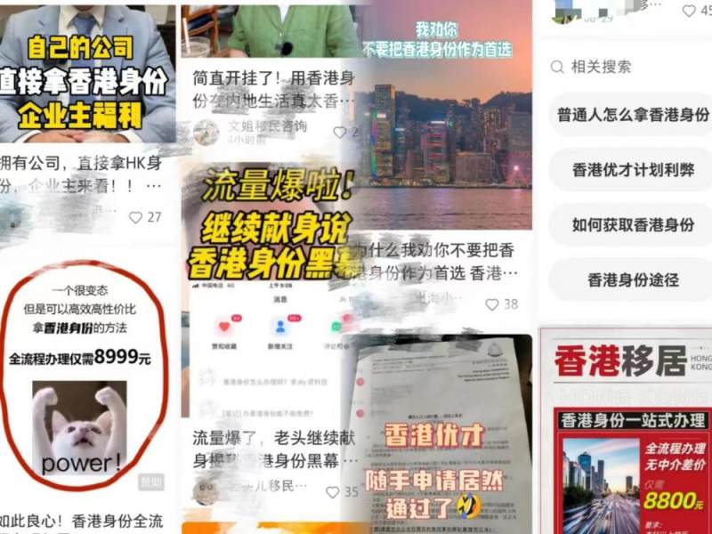 有从业者向财联社记者抱怨,现在的移民中介市场非常混乱,打开微信视频号和小红书,会收到很多香港身份中介广告,“价格一家比一家低,从一万多到8888,再到5000和4988都有。”从这位从业者口中得知,这些低价“香港身份申请”通常都是只管递交申请而不管是否获批。中介告诉记者,以打分制的“优秀人才入境计划”为例,一般120分以上的申请者较易获批,但这些低价中介会鼓励110分甚至100分以下的申请者申请。还有些中介采用更为迷惑的退款制,例如收取申请者5万人民币,如无获批则退还3万至4.2万不等的“服务费”。
