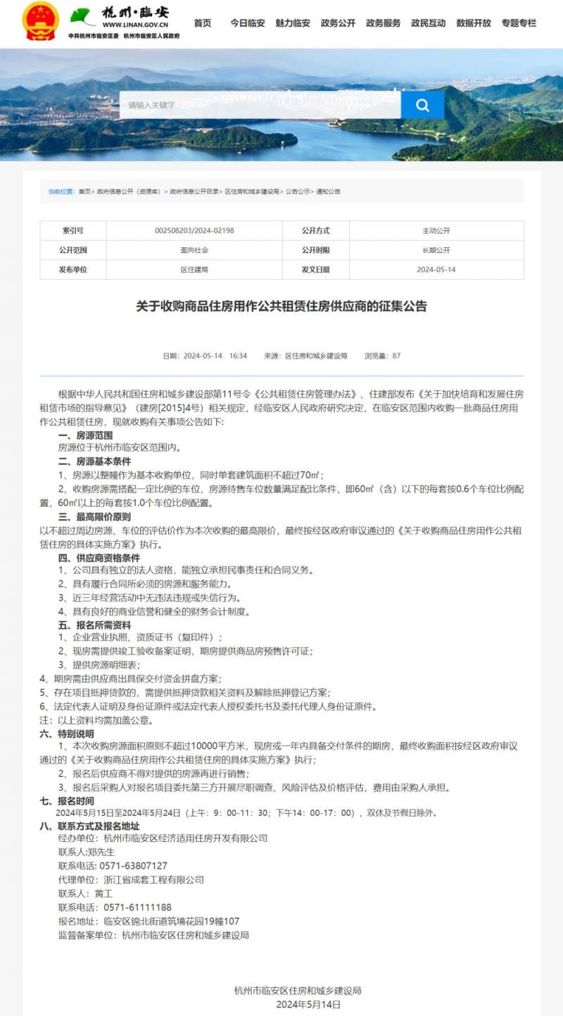 杭州市临安区:在区内收购一批商品住房用作公共租赁住房