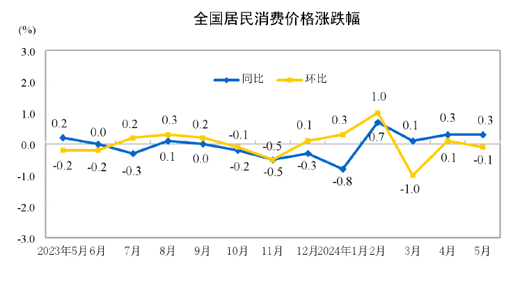 2024年5月份,全国居民消费价格同比上涨0.3%。其中,城市上涨0.3%,农村上涨0.4%;食品价格下降2.0%,非食品价格上涨0.8%;消费品价格持平,服务价格上涨0.8%。1—5月平均,全国居民消费价格比上年同期上涨0.1%。