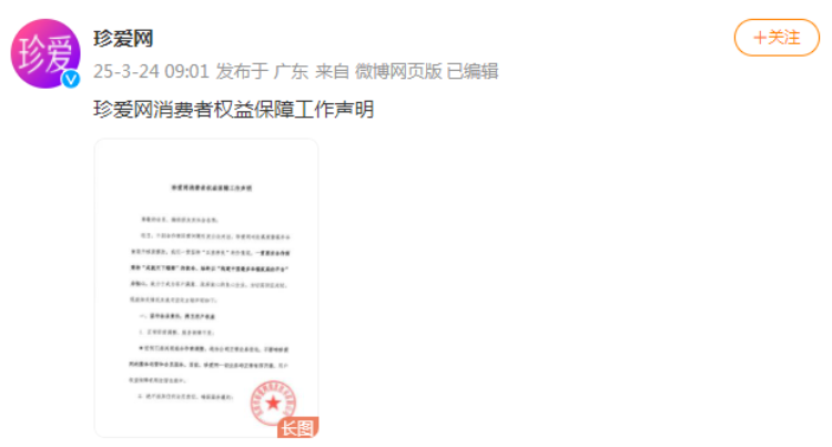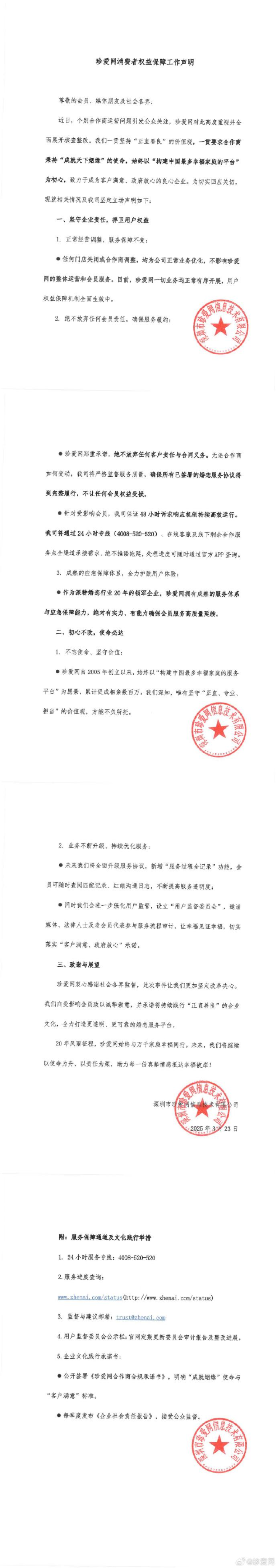 3月24日,珍爱网通过微博发布《消费者权益保障工作声明》称,近日,个别合作商运营问题引发公众关注,珍爱网对此高度重视并全面展开核查整改。珍爱网称,任何门店关闭或合作商调整,均为公司正常业务优化,不影响珍爱网的整体运营和会员服务。目前,珍爱网一切业务均正常有序展开,用户权益保障机制全面生效中。珍爱网承诺,绝不放弃任何客户责任与合同义务,无论合作商如何变动,公司将严格监督服务质量,确保所有已签署的婚恋服务协议得到完整履行,不让任何会员权益受损。