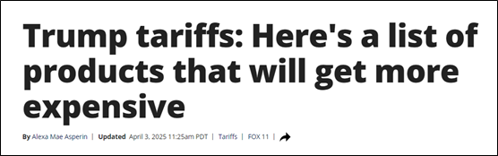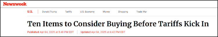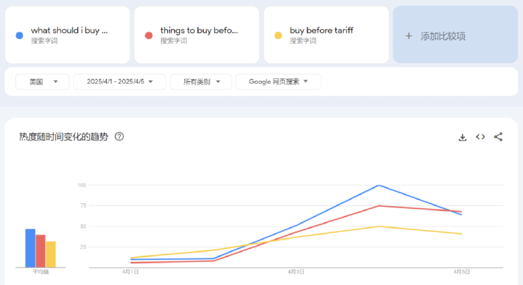 自4月2日至今,在谷歌搜索平台,“我该在关税实施前买什么”、“关税实施前应该买的东西”以及“买在关税实施前”等关键词搜索频率激增(见上图),多家美媒的报道也列出了可能因关税导致涨价的商品类别,“中国”一词几乎贯穿始终。