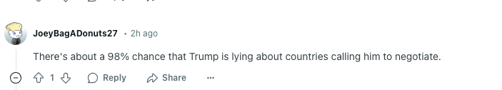 “特朗普说有很多国家要和他谈判这件事有98%的可能是在撒谎。”