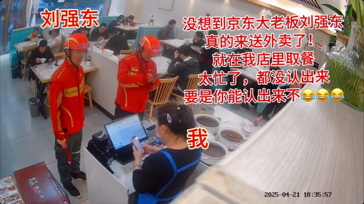 4月23日,在社交平台,有餐馆老板发视频称,当日刘强东来到自己店里取餐,自己都没认出来。