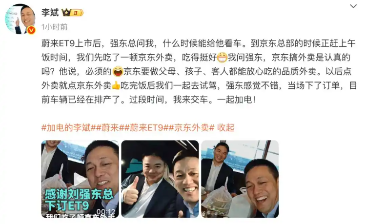 就在前段时间,蔚来创始人、董事长、CEO李斌在社交平台发布与刘强东一起吃外卖的视频。刘强东在视频中表示:“京东搞外卖是认真的,要做父母、孩子、客人都能放心吃的品质外卖。”