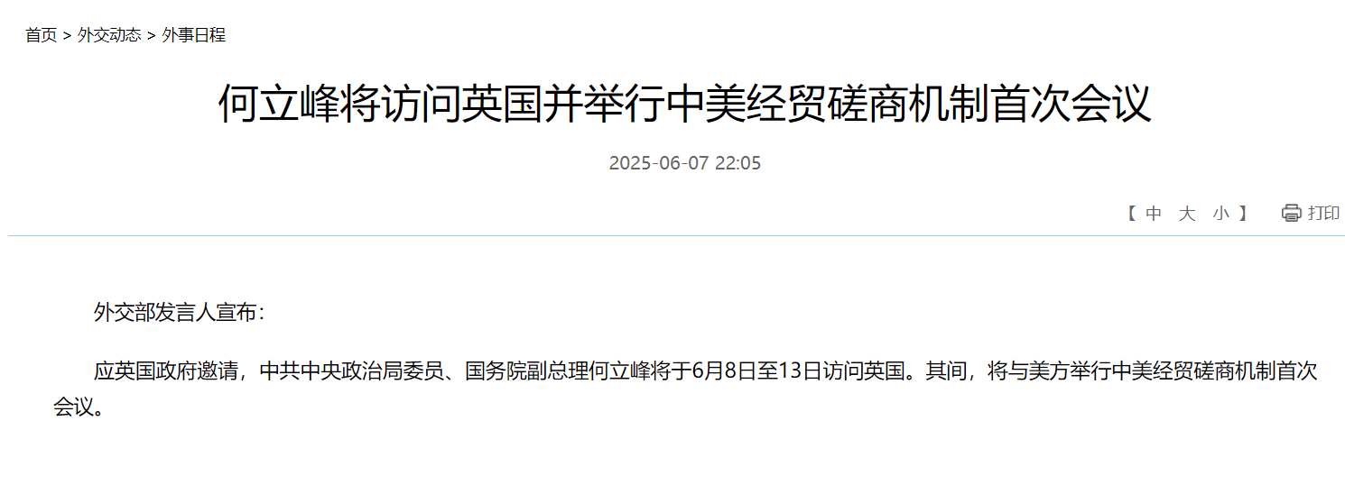 应英国政府邀请,中共中央政治局委员、国务院副总理何立峰将于6月8日至13日访问英国。其间,将与美方举行中美经贸磋商机制首次会议。