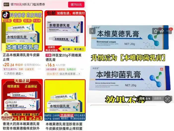 然而,多家直播电商平台所销售的“本唯抑菌乳膏”包装和“本维莫德乳膏”高度相似。商家将原药品包装上的商标替换成“某某堂”,并标注“新批次、新日期、新包装”,宣称产品从“本维莫徳乳膏”升级“本唯抑菌乳膏”,同时说明书内容将正品主要化学成分改为中药成分,并突出“治疗银屑牛皮癣”等疗效表述。