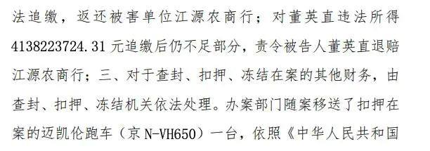 上述被拍卖的迈凯伦豪华跑车,是对董英直违法所得81.76万元购买对应的份额及其收益依法追缴。其中还提到,董英直违法所得41.38亿元追缴后仍不足部分,责令其退赔江源农商行。
