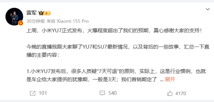 关于部分针对销售数据的质疑,雷军回应称:“网上很多人质疑大定有水分7天可退。这其实是行业惯例,也就是车企给大家提供的犹豫期。有3天的犹豫期,我们定7天主要是担心试驾不过来。”