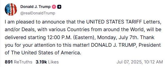 特朗普6日在社交媒体“真实社交”上说:“我很高兴地宣布,美国将于7月7日,星期一,中午12时(美东时间)开始向各国递送关税信函或协议。”
