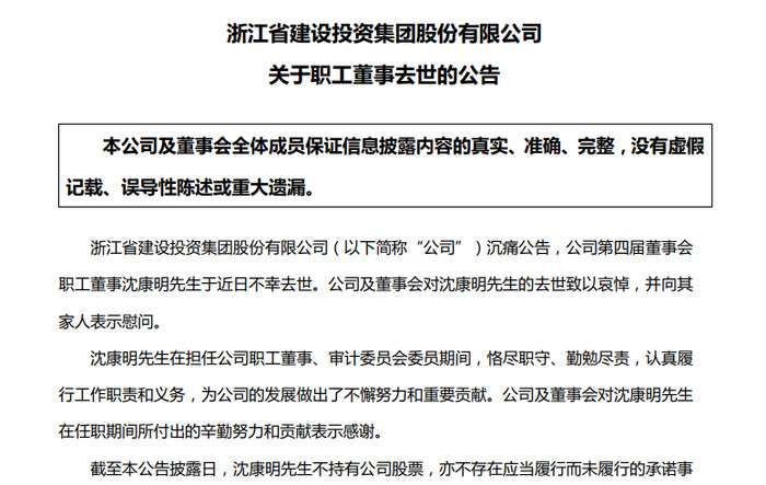 新黄河客户端消息,大鱼财经记者注意到,浙江省建设投资集团股份有限公司(下称“浙江建投”)(002761.SZ)于7月3日公告称,集团职工董事沈康明于近日不幸去世,年仅54岁。另有消息称,沈康明疑似坠楼身亡。7日17时许,记者多次拨打浙江建投公开电话进行求证,但未有人接听。